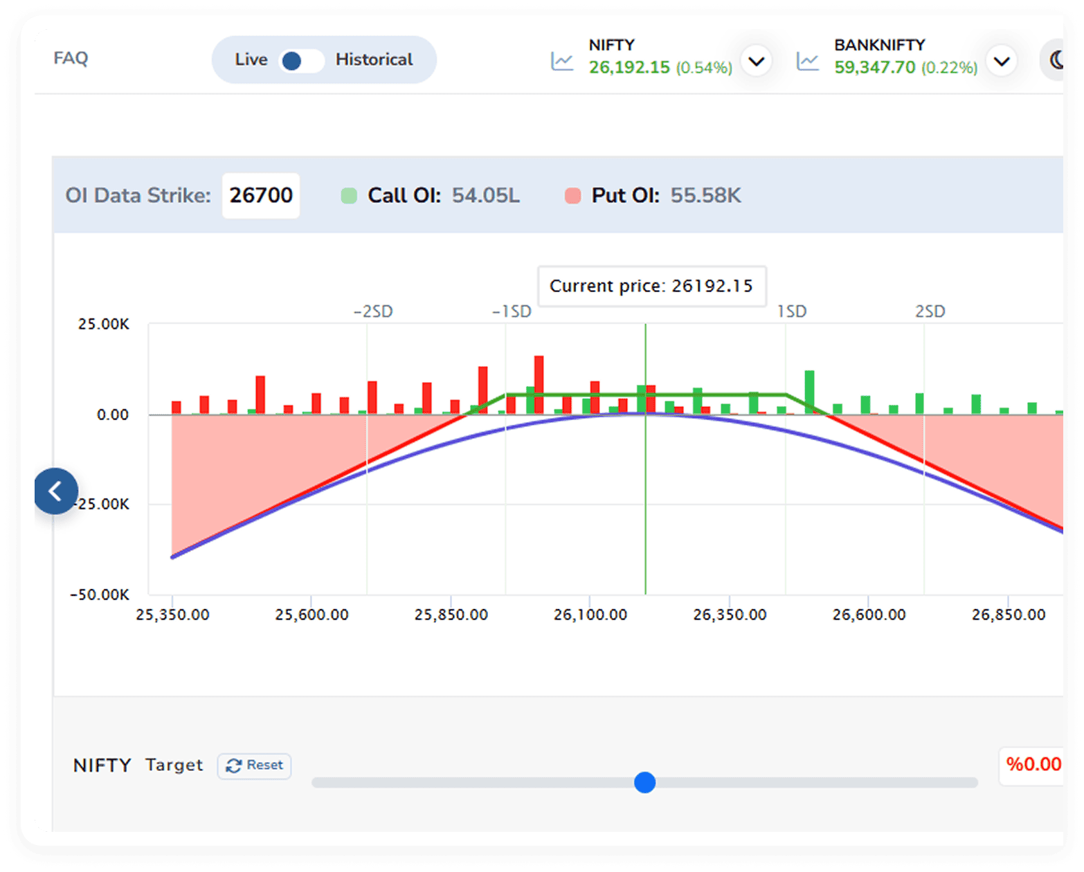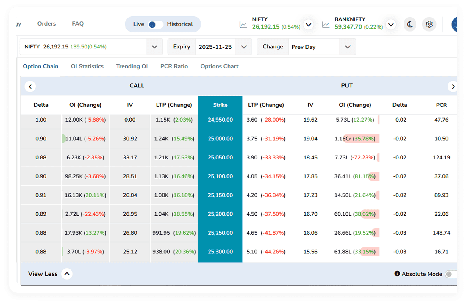 Work with a detailed option chain that updates in real time and track the Put Call Ratio to read market mood.