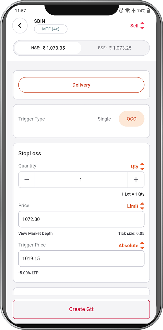 Use advanced order types like GTT, Iceberg, OCO (Target & Stop-Loss), and Basket orders, with smart price and time-based exit automation for disciplined trade execution.