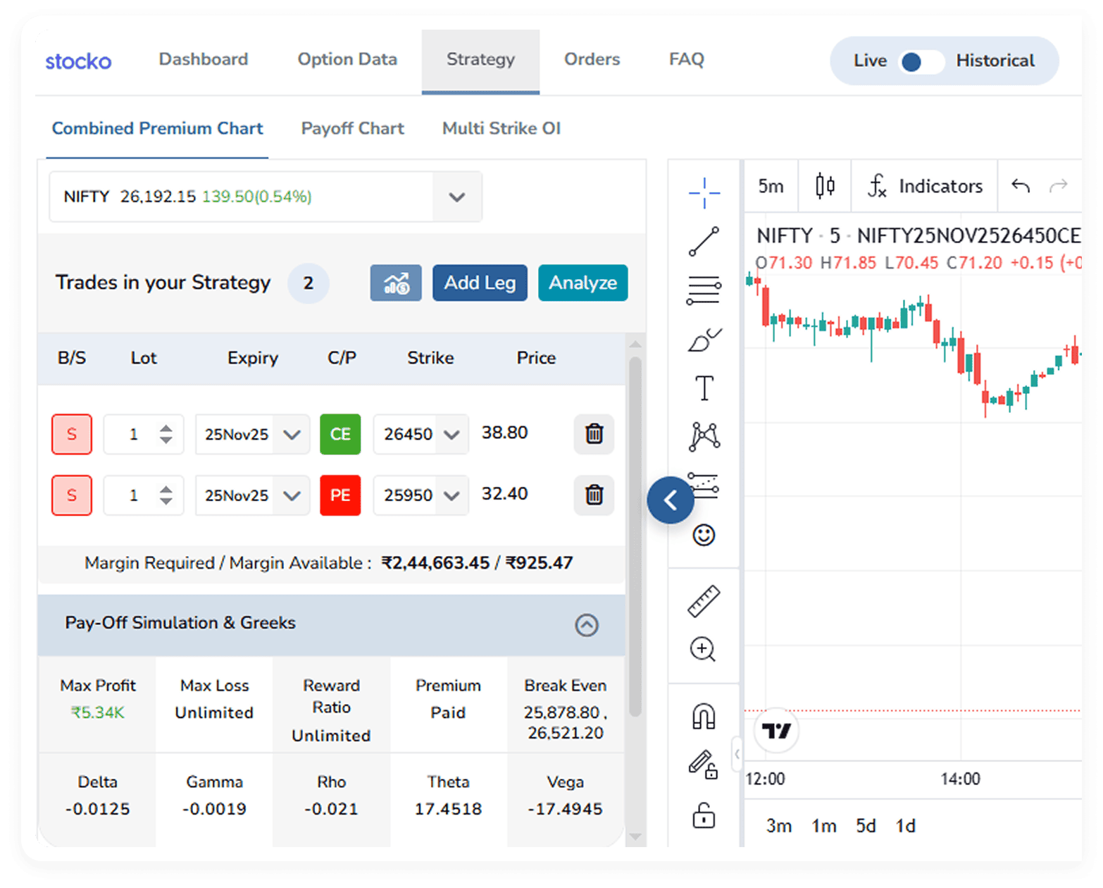 See payoff diagrams with maximum profit, maximum loss, breakeven levels, margin needed and live Greeks before you place any order.