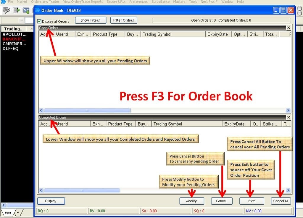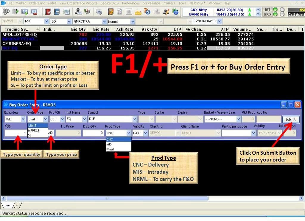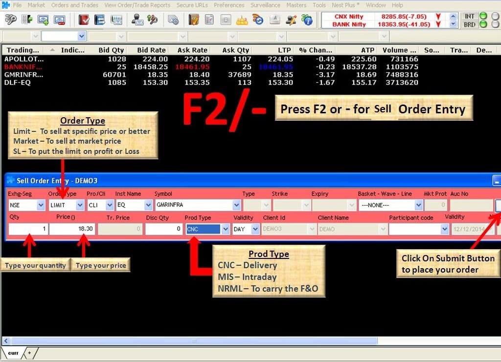 Press F2 / – >> Select Order Type >> Enter Quantity >> Enter price >> Select Product Type >> Submit / Hit Enter