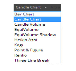 By default, a two-dimensional candlestick chart will be displayed. Users can change the candlestick style to other available chart styles using the Price Style drop-down menu located in the Advanced Chart Toolbar.