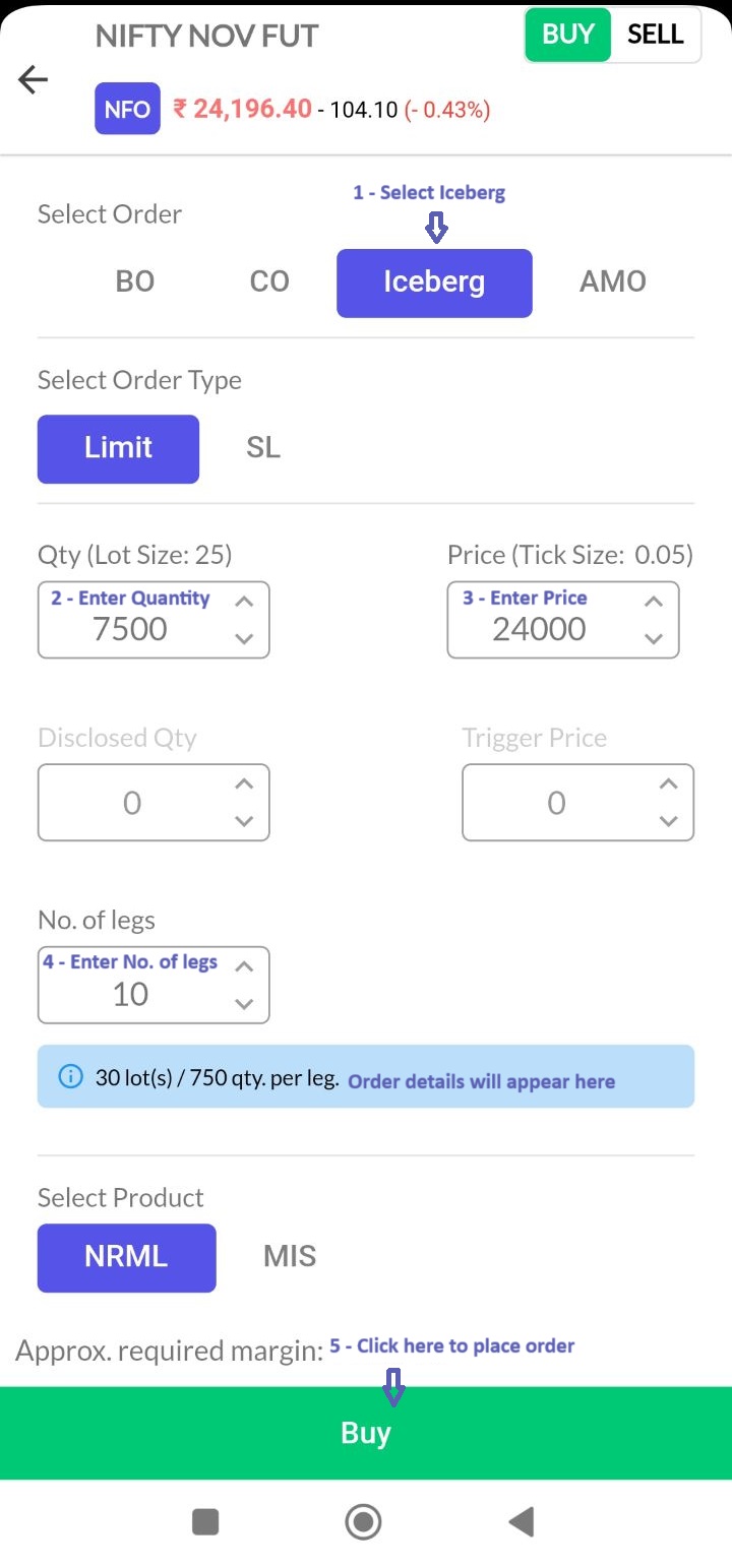 4 – Select Iceberg >> Enter the required quantity, price, and trigger price >> Specify the number of legs >> Place the order