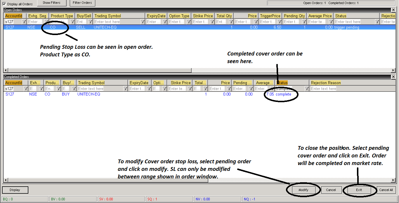 Once the CO order is placed completed market order or limit order and pending stop loss will be shown in the order book (F3). You can verify that it a cover order as the product type will be CO for the same. Stop Loss can be modified from the order book by using modify from the bottom of the window in the prescribed range only. Also note that against buying CO selling order should not be placed, as it will create a fresh position in your account and vice-versa.