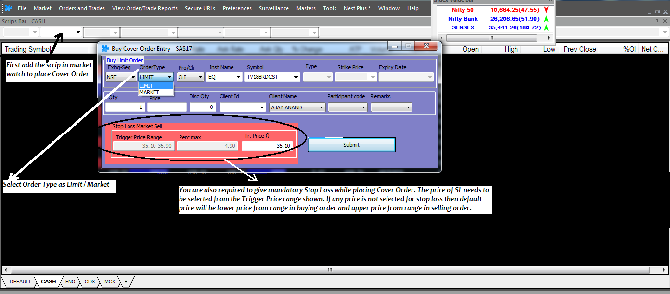 For placing a cover order add the script in the market watch as shown below. For Buy cover order click (Shift+F1) & Sell Cover Order (Shift+F2). The Buy/Sell order will execute at the market price/limit price and stop-loss can be defined as per the defined stop loss range.